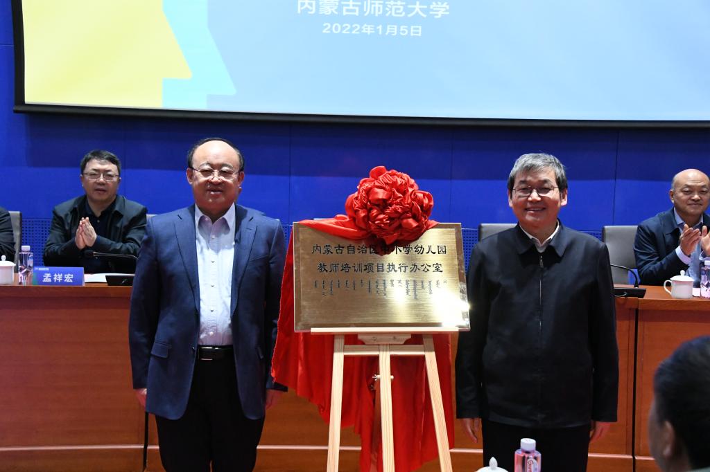 教育厅教师工作处处长武秀珍宣读了《关于成立内蒙古自治区中小学幼儿园教师培训项目执行办公室的通知》。自治区党委教育工委委员、教育厅党组成员、副厅长李占峰与我校党委书记阿拉坦仓教授共同为“项目办”揭牌。