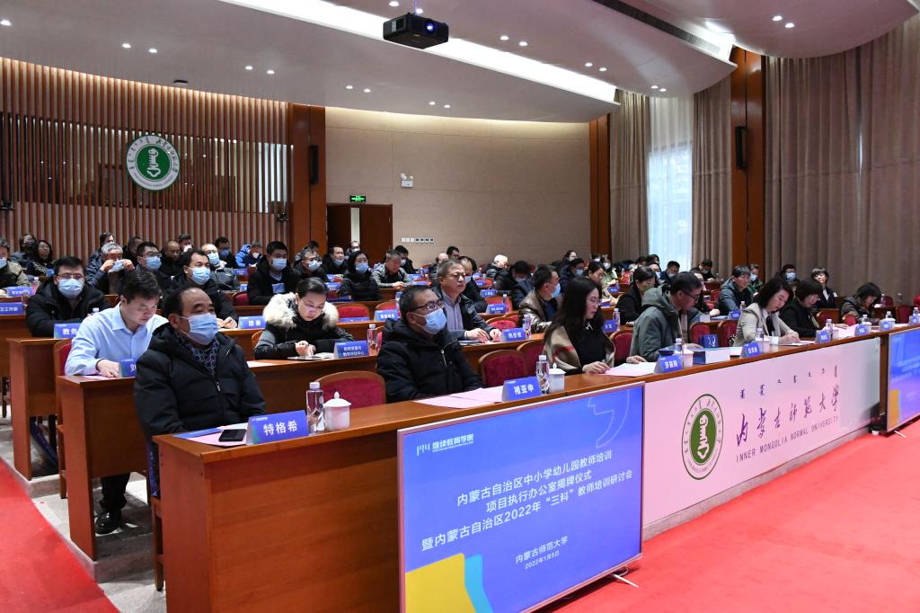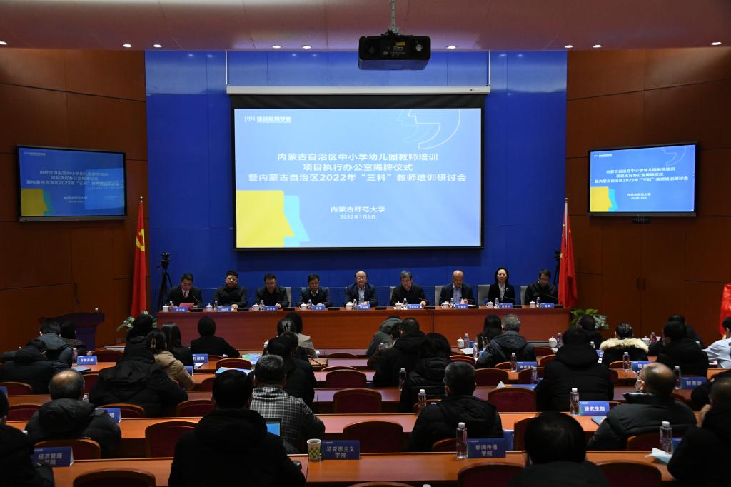 1月5日上午,内蒙古自治区中小学幼儿园教师培训项目执行办公室(以下简称“项目办”)揭牌仪式暨内蒙古自治区2022年“三科”教师培训研讨会在我校信息楼报告厅隆重举行。自治区党委教育工委委员、教育厅党组成员、副厅长李占峰,自治区教育厅教师工作处处长武秀珍、教研室主任孙柏军,内蒙古民族大学党委委员、副校长任军,包头师范学院党委委员、副校长王有亮,呼伦贝尔学院党委委员、副校长孟祥宏,赤峰学院、集宁师范学院6776永利集团负责同志,我校党委书记阿拉坦仓,副校长宫箭,各部门、各学院主要负责人以及6776永利集团全体教职工参加了会议。会议由我校党委委员、副校长张海峰主持。