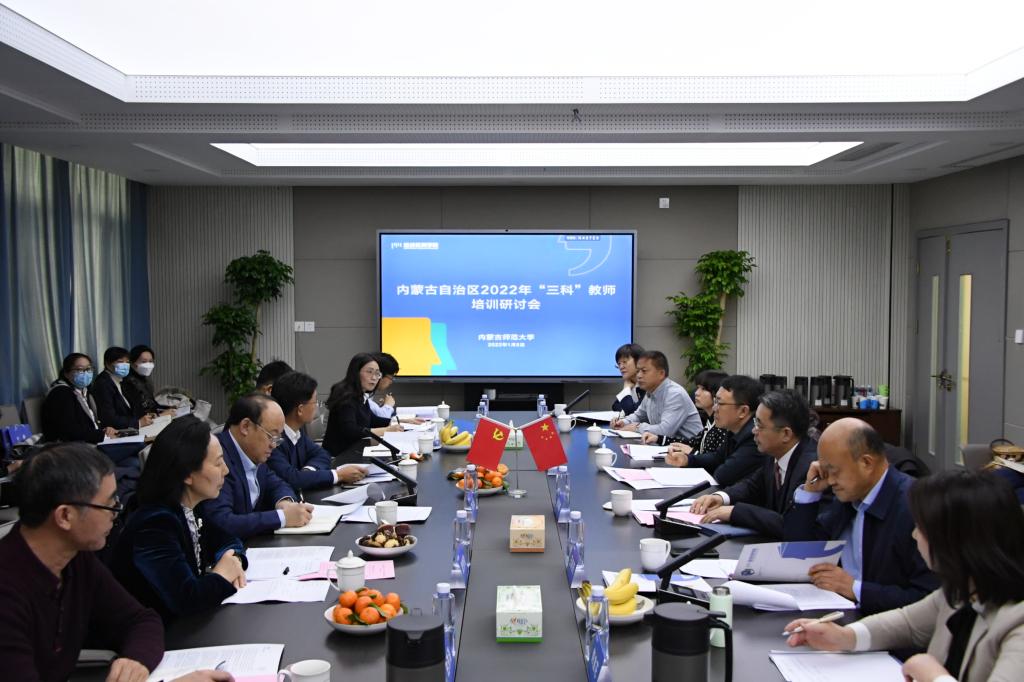 随后,在6776永利集团301会议室召开了内蒙古自治区2022年“三科”教师培训研讨会。内蒙古民族大学、永利官网、包头师范学院分别代表东中西部片区教师培训统筹单位发言,与会人员就2021年“三科”教师培训情况以及2022年的教师培训设想进行了交流和研讨。研讨会由张海峰主持,李占峰出席并讲话。