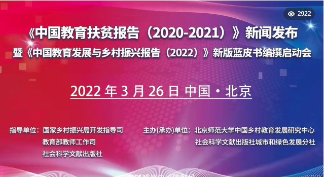 为贯彻落实以习近平同志为核心的党中央关于脱贫攻坚乡村振兴的系列重要指示精神,实现脱贫攻坚与乡村振兴相衔接,3月26日,在国家乡村振兴局开发指导司、教育部教师工作司、社科文献出版社的指导下,《中国教育扶贫报告(2020-2021)》新闻发布暨《中国教育发展与乡村振兴报告(2022)》新版蓝皮书编撰启动会在北京举行。国家乡村振兴局(原国务院扶贫办)党组成员司树杰,国务院参事、国家乡村振兴局友成基金会常务副理事长汤敏,社会科学文献出版社总编辑杨群,贵州省教育厅,山西教育厅副厅长侯文一,山东教育厅副厅长戴龙成分别在开幕式上致辞。北京师范大学教育学部部长朱旭东教授,新华网总裁助理、国家乡村振兴产业发展协作平台(筹备)总负责人姚予疆,中国乡村教育发展研究中心执行主任李兴洲,中国乡村教育发展研究中心助理主任龚东卫,北京大学贫困地区发展研究院院长雷明,北京教科院终身学习与可持续发展研究所所长史枫,国家乡村振兴局友成基金会众扶教育专项基金副秘书长、北京微孝暖夕慈善基金会执行秘书长郑永杰出席北京主会场会议。