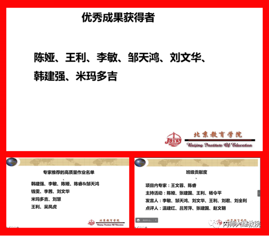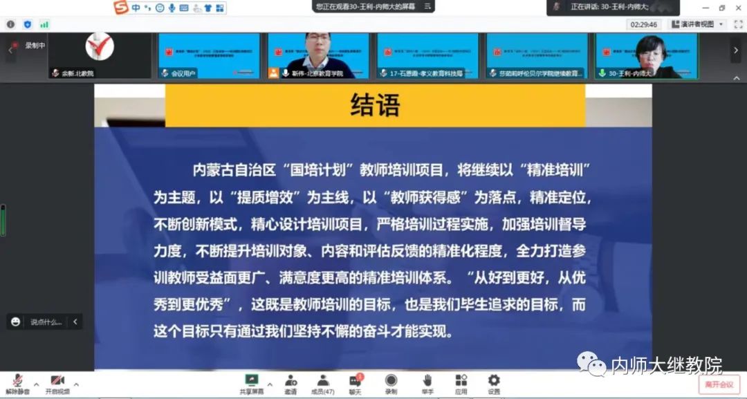 在结业仪式上,王利被评为“优秀成果获得者”,同时在“专家推荐的高质量作业名单”和“班级贡献度”等方面,被高度评价。 通过本次研修班,充分展示了内蒙古自治区“国培计划”教师培训工作取得的成就,进一步加强了内蒙古自治区中小学幼儿园教师培训项目执行办公室与全国各地“国培计划”实施单位的沟通与交流,对于吸收和借鉴其他兄弟省份先进的教师培训经验,高质量地开展我区的教师培训具有重要意义。