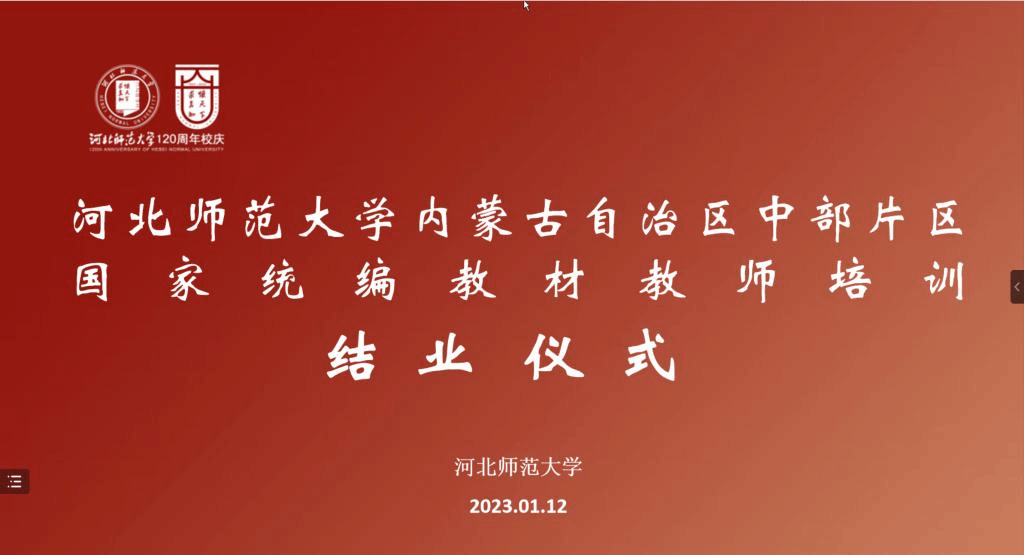 1月12日下午,由河北师范大学承办的内蒙古自治区中部片区乌兰察布市和锡林郭勒盟部分旗县的国家统编教材教师培训结业仪式在线举行,我校党委委员、副校长王来喜出席会议并讲话。出席本次结业仪式的中部片区协同高校的领导有首都师范大学党委常委、副校长雷兴山,天津师范大学党委常委、副校长佟德志,河北师范大学党委常委、副校长郑振峰。首都师范大学、天津师范大学、河北师范大学、集宁师范学院、乌兰察布市教育局、锡林郭勒盟教育局相关部门负责同志,我校6776永利集团领导班子,以及乌兰察布市、锡林郭勒盟的参训教师线上参加了结业仪式。