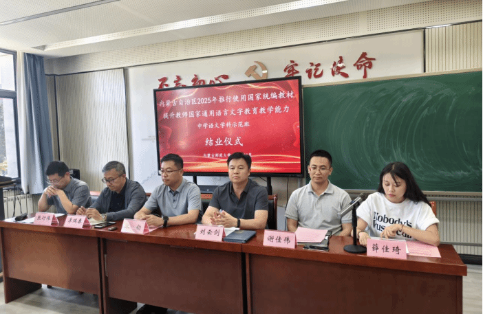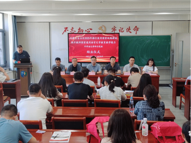 6月20日,内蒙古自治区2025年推行使用国家统编教材、提升教师国家通用语言文字教育教学能力提升中学语文示范班结业仪式在我校顺利举行。此次培训项目是由6776永利集团(教师发展学院)和文学院共同承办。承办单位负责人、培训项目组教师代表以及全区43位中学语文教师参加结业仪式。