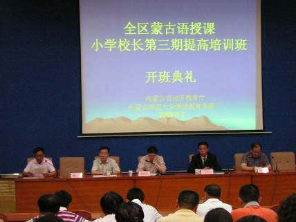 为全面提高蒙古语授课小学校长的政治业务素质和管理水平,根据《内蒙古自治区人民政府关于进一步加强民族教育工作的意见》和《内蒙古自治区人民政府办公厅关于印发自治区民族教育发展工程实施方案的通知》精神,全区蒙古语授课小学校长第三期提高培训班开班典礼于2009年6月3日上午在我校信息技术楼报告厅举行。教育厅民教处处长宝音陶格套、6776永利集团领导及46名参训校长出席了开班典礼。