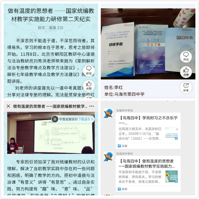 线下集中培训结束后,乌海市第四中学李红老师在美篇中写到,本次培训中专家的引领加深了我对统编教材的认识和理解,解决了当前教学实践中存在的一些问题和困惑,明确了教学的方向。把初中道德与法治课“有意义”讲得“有意思”。通过自身实践,努力构建有“趣”味、“意”味、“品”位的课堂,积极承担“立德树人”的学科使命,让真善美的种子在学生心中生根发芽。努力成为学生成长中的重要引路人,用心去教,用情去教。同时激励自己不断提高自身的专业性,努力做有情怀有理想的好教师。