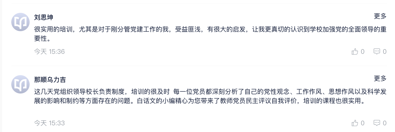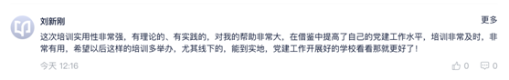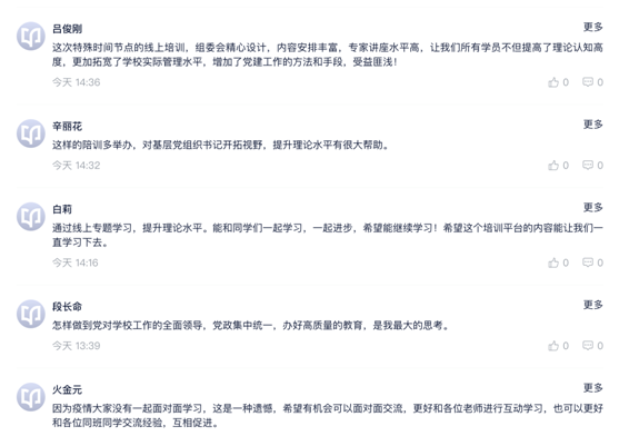 在两批总共为期10天的直播过程中,所有参训老师都积极参与每场直播的研讨及互动,针对学校党建工作及自身工作中的问题,提出了许多建设性的意见及建议,并表示培训结束后,将会结合所在学校的实际情况,将培训知识转化为实践的智慧,巩固和丰富培训成果。