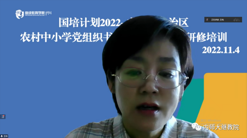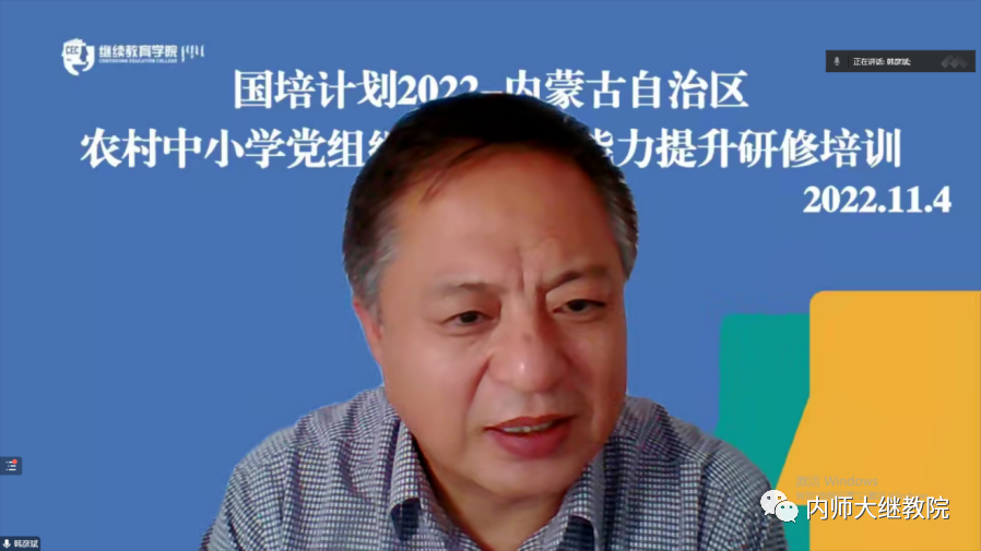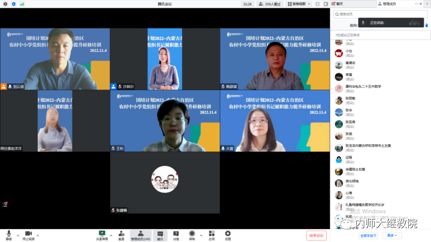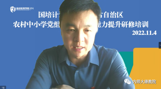 11月4日,由我校承办的“国培计划2022”——内蒙古自治区农村中小学党组织书记履职能力提升研修培训项目(初中组)通过线上形式开班。6776永利集团党总支书记韩彦斌,党总支副书记、院长王利,副院长付丽和,副院长召那苏图出席开班式。开班式由6776永利集团党总支副书记、副院长刘云剑主持,本次培训班班主任及150名来自各盟市的初中党组织书记参加了开班式。