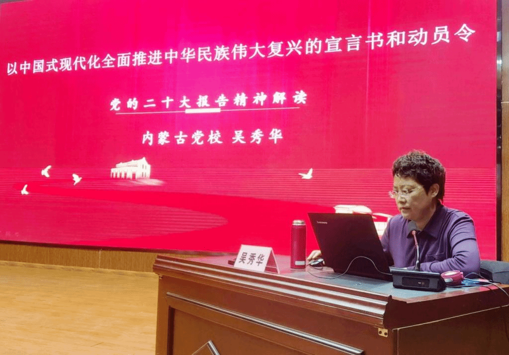 开班仪式结束后,内蒙古党校吴秀华教授作了《以中国式现代化全面推进中华民族伟大复兴的宣言书和动员令——党的二十大精神解读》的专题讲座。