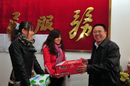 杨一江校长亲自把慰问品交与顶岗实习学生