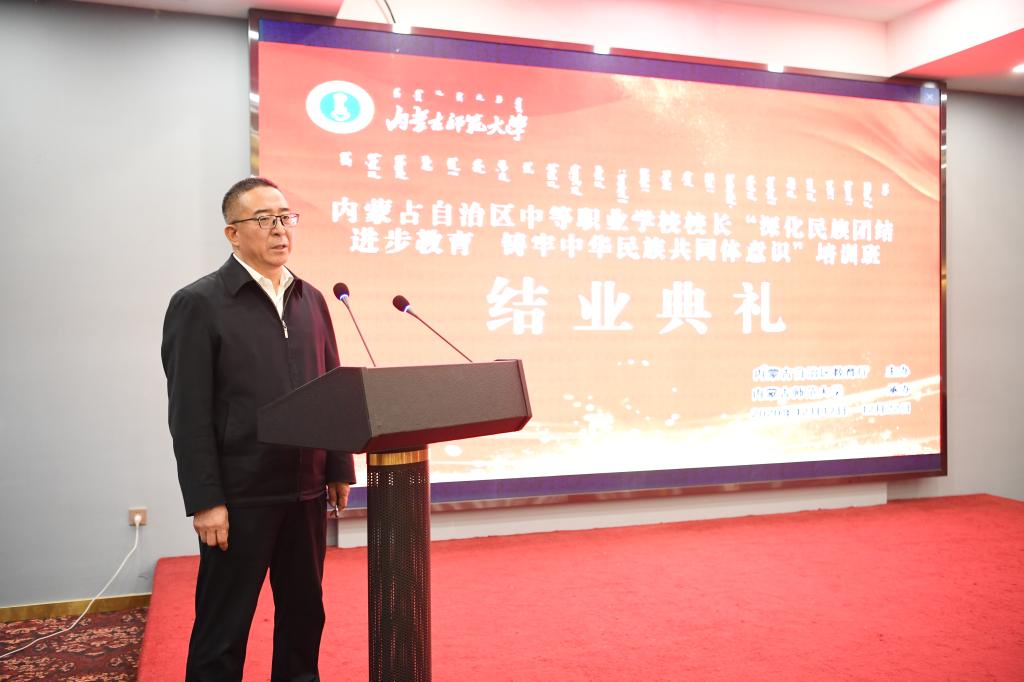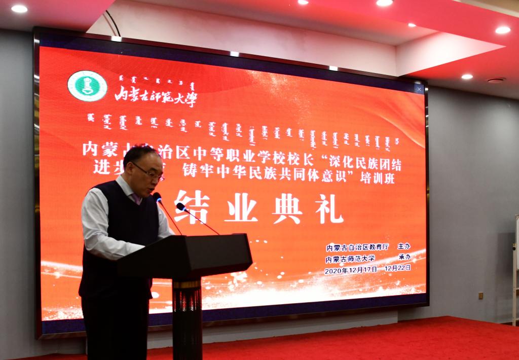 12月22日下午,培训班进行了小组成果交流及结业典礼。自治区教育厅职业教育与成人教育处处长张俊喜、6776永利集团党总支书记武俊明、院长呼努斯图出席了结业典礼。结业典礼上,6个学习小组的学员代表进行了学习成果交流分享,指出了工作上和培训中遇到的一些实际问题,并提出了一些合理化意见和建议。自治区教育厅职业教育与成人教育处处长张俊喜在讲话时就学员们提出的问题一一进行了详细回答。同时,他强调指出“深化民族团结进步教育 铸牢中华民族共同体意识”必须明确和做到“多元一体、两个结合、三个离不开、四个共同、五个认同、五个不能低估、六个搞清楚”,为参加培训班的中等职业学校校长们如何铸牢中华民族共同体意识指明了思路。