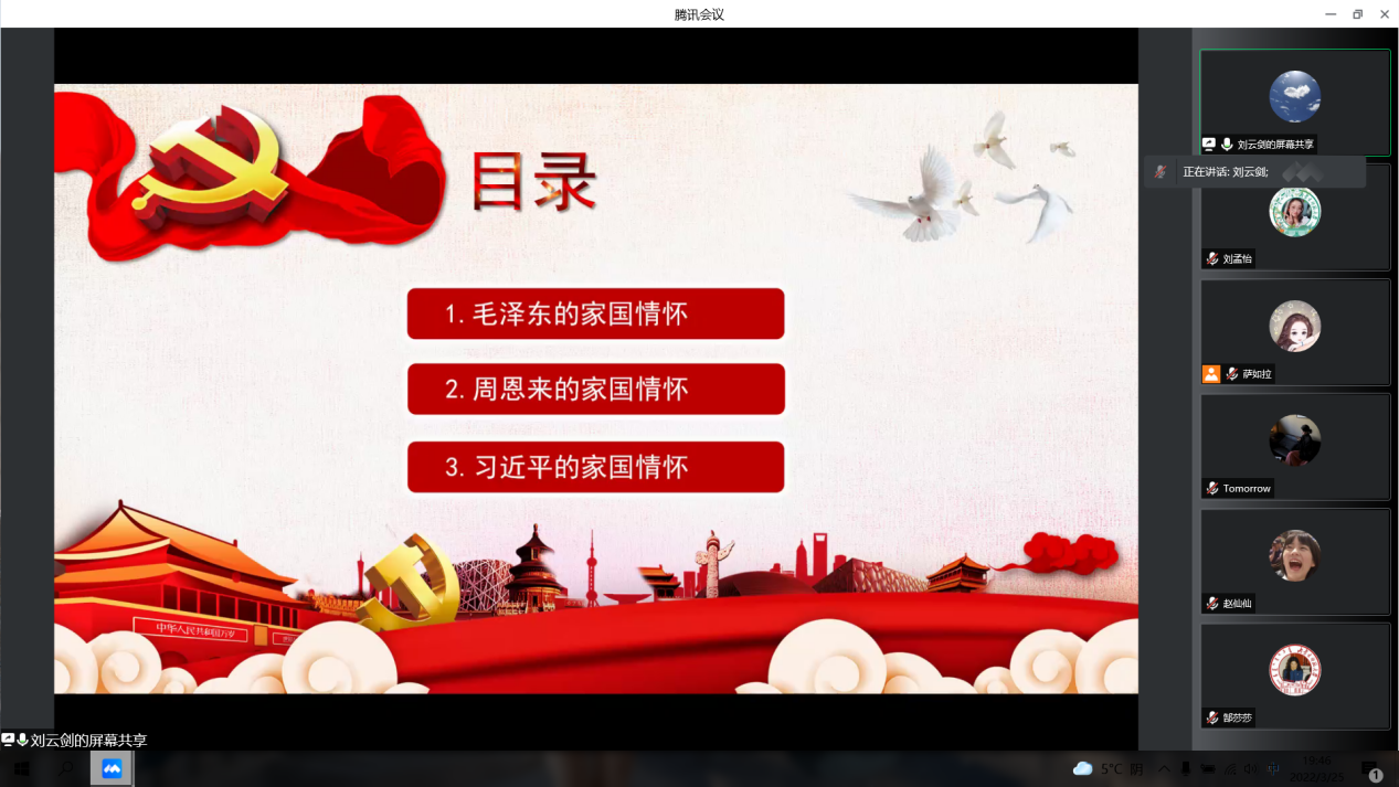 3月25日晚,学院党总支在腾讯会议上开展了“传承红色基因,厚植家国情怀”主题教育党课。本次党课由学院党总支副书记、副院长刘云剑主讲,由学生党支部书记萨如拉主持。部分学生党员代表、4名党员发展对象和49名入党积极分子在线上聆听了党课。