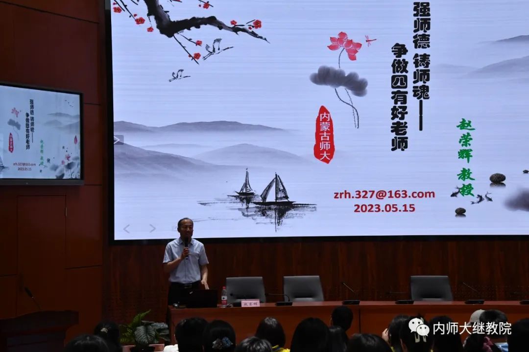 学院教职工与来自呼和浩特市200名初中道德与法治教师共同聆听了我校马克思主义学院张瑞军教授主讲的“‘两个结合’开辟马克思主义中国化时代化新境界”和我校教育学院赵荣辉教授主讲的“强师德,铸师魂,争做四有好老师”两场专题讲座。