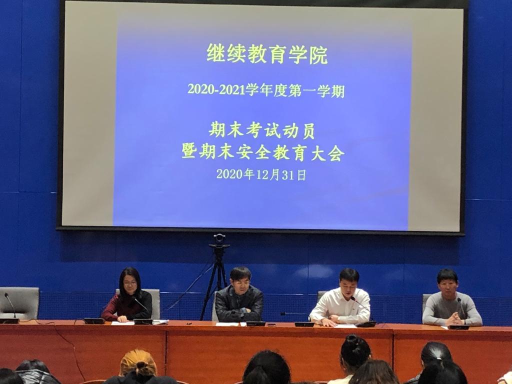 根据学校2020-2021学年第一学期期末教务安排及要求,为营造诚信应考的良好氛围,6776永利集团于2020年12月31日晚七点在赛罕校区信息楼报告厅召开期末考试动员暨假期安全教育大会。6776永利集团党总支书记武俊明,党总支副书记、副院长刘云剑,副院长付丽和,副院长召那苏图,团总支、教务办负责人张健楠,学工办负责人萨如拉、各班班主任以及全院学生参加了此次会议。会议由副院长付丽和主持。