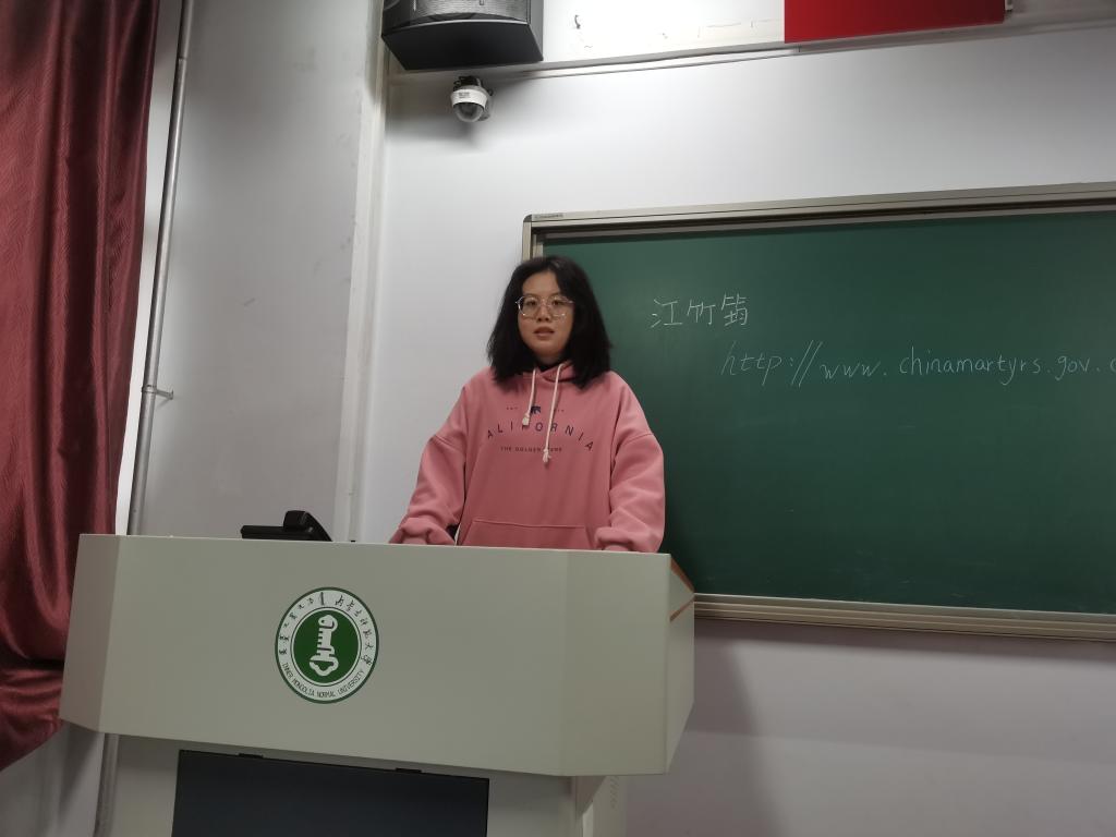 刘悦雯分享的是中共川东临时委员会江竹筠的事迹。1948年4月,《挺进报》的发行机关被伪装进步的特务打入,以顺藤摸瓜的方式破坏了重庆市委,6月间,江竹筠被逮捕。后江竹筠被送到重庆的“中美特种技术合作所”的“渣滓洞”监狱后,惨遭手指夹竹棍等毒刑的残酷折磨,仍坚贞不屈,并领导狱中的难友同敌人展开坚决的斗争。1949年11月14日,江竹筠被特务秘密枪杀,然后被用盐酸毁尸灭迹,时年29岁。